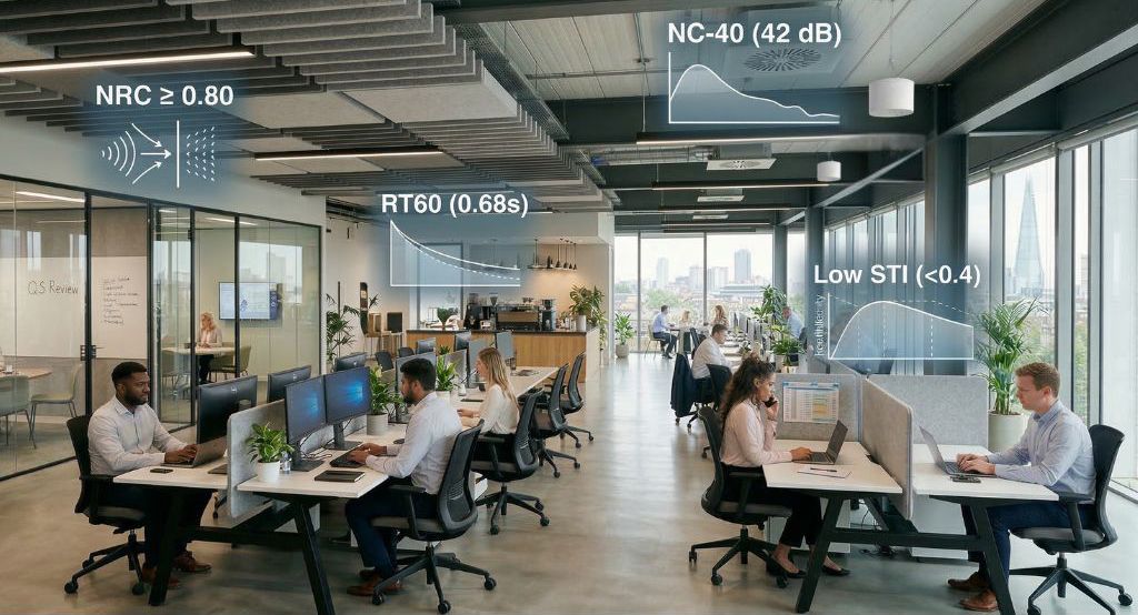 Effective office acoustic design is not a single-metric exercise. RT60 establishes spatial character, NC sets the noise floor baseline, STI quantifies the clarity-privacy balance, and NRC drives material specification. Advanced metrics like C50 and EDT add diagnostic precision for complex projects. Sound masking — particularly with adaptive volume control — is the layer that ensures those measurements translate into consistent, real-world performance. Used together, these parameters give acousticians the objective evidence to prove a design works, defend specification decisions, and deliver environments where people can actually think.