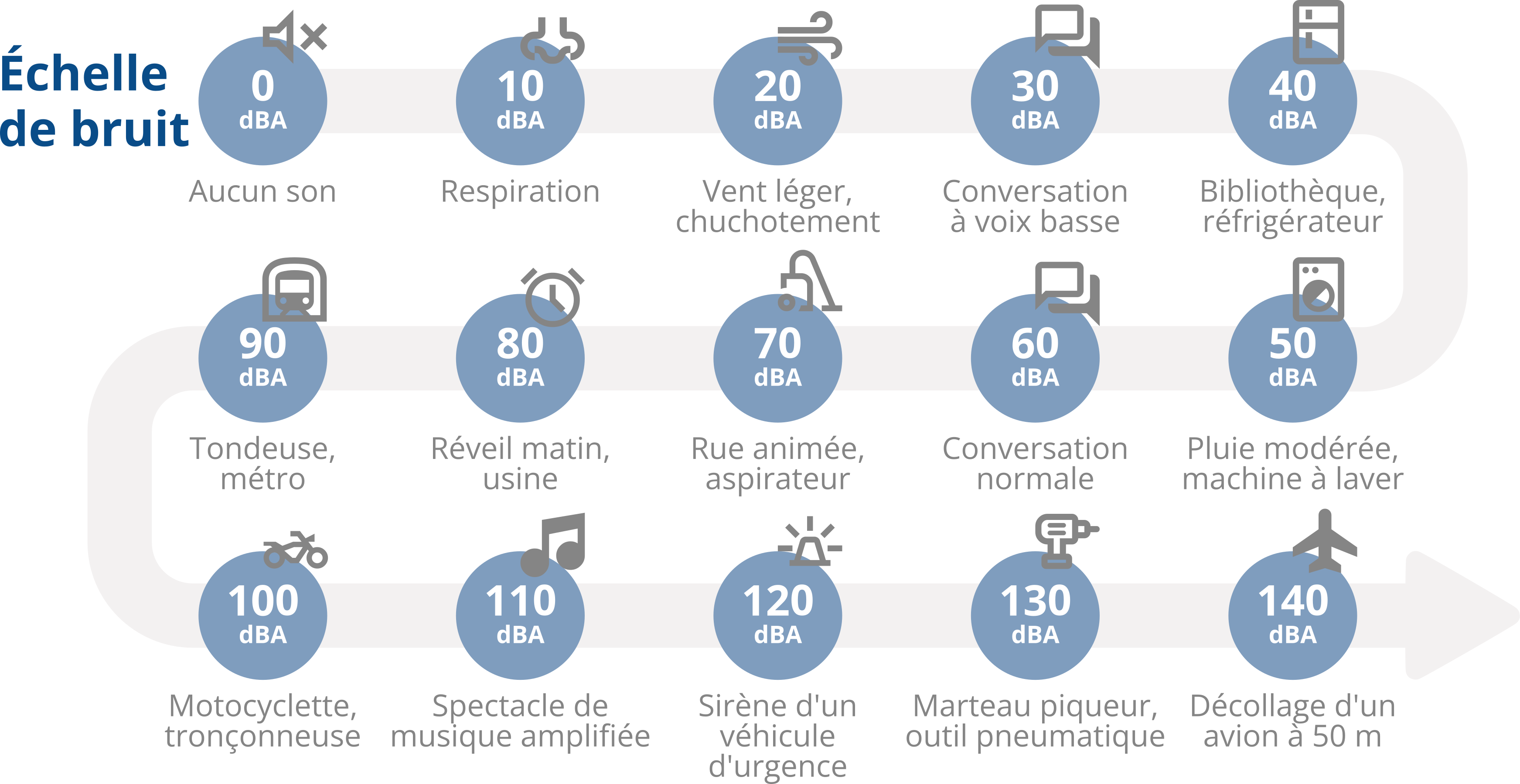 Pour une entreprise, plusieurs catégories de sources peuvent générer du bruit perceptible dans le voisinage. Les identifier et les caractériser est la première étape de toute démarche de gestion acoustique. La figure suivante, inspirée de l'échelle de bruit de l'INSPQ, présente différentes sources de bruit avec leur niveaux associés.